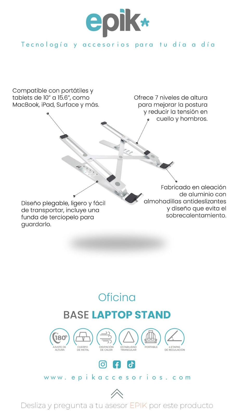- Ofrece niveles de altura para mejorar la postura y reducir la tensión en cuello y hombros